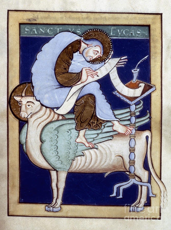 Irenaeus compared Luke to the being who looked like a winged ox. This symbolised the priestly aspect of the Gospel and the sacrifice at the heart of Jesus’ ministry.