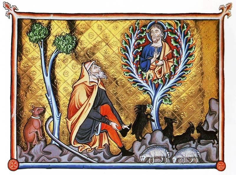After forty years had passed, an angel appeared to Moses in the flames of a burning bush in the desert near Mount Sinai.