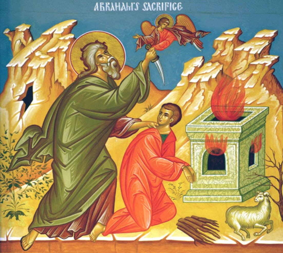 Abraham climbs a mountain in the area of Moria (near modern day Jerusalem) with Isaac. His son lays down on a makeshift altar. Abraham raises a knife, but at the last minute a voice from Heaven tells him to stop. In a thicket, a ram is caught. The ram is sacrificed in Isaac’s place.