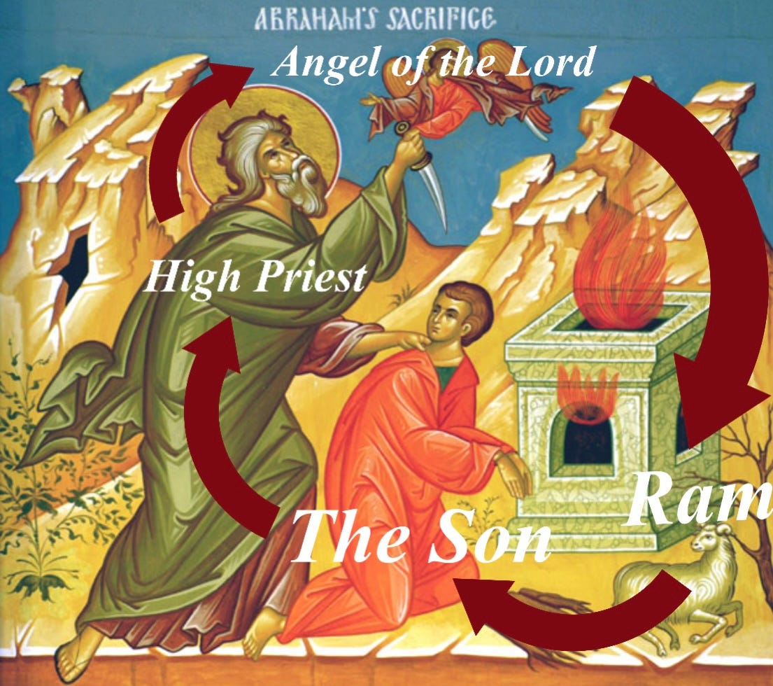 So, in this story, we see Jesus (High Priest) sacrificing Jesus (Son), who is stopped by Jesus (Angel of the Lord), so Jesus (Ram) can be sacrificed in His place and return to His Father. And then Jesus (Angel of the Lord) stops Jesus (Son) being sacrificed by Jesus (High Priest) and provides Jesus (Ram) as a substitute, so Jesus (Son) can return to His Father. And so on, and so on